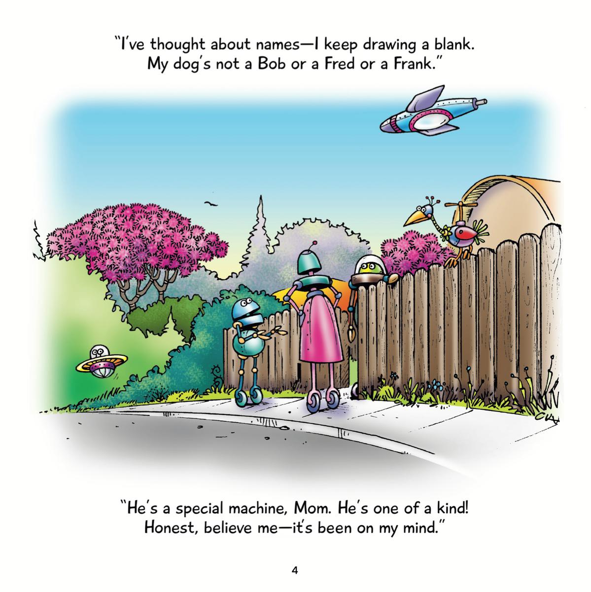 Timbot loves the new puppy that his Grandbot built for him, but he can’t decide what to name him. When the dog runs off, Tim is unable to call him back since the dog doesn’t have a name. While the dog is off having a grand adventure, Tim tries to find his pet before he gets into trouble, but he’s too late. With Grandbot’s quick thinking, they are able to find the dog and bring him home safely. And, in the end, Tim comes up with the perfect name!