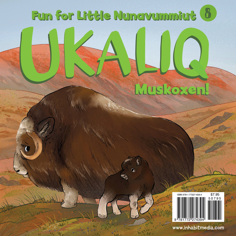 Ukaliq: Muskoxen includes photos and fun facts about muskoxen, like how their long fur keeps them warm! A traditional story about a muskox and a walrus is included. In this issue you can also put a story in order, spot the difference in two pictures, and finish a drawing!