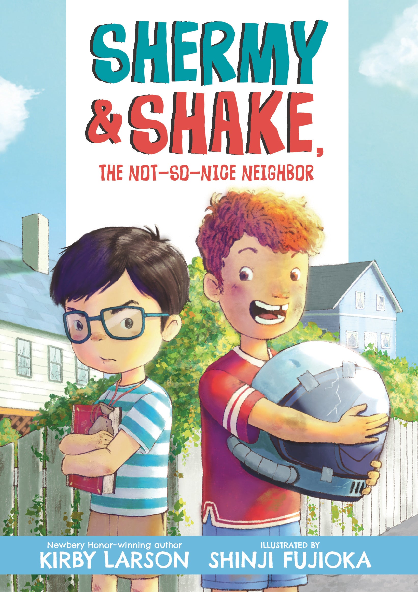 When a new kid comes to stay with his grandmother at the house next door, Shermy’s plans for a quiet, relaxing summer are completely upended. That’s because Shake is nothing like Shermy. And Shermy is nothing like Shake. Shermy likes to read quietly in the shade of a tree. He knows the proper way to do a puzzle. He collects treasures in the pouch he wears around his neck, and the books on his shelves are alphabetized by author. Shake likes to play street hockey or space explorers. He gobbles up rocket ice pops and Toaster Tarts. He shows up unannounced and plays board games by his own rules. As the two boys are forced to spend more and more time together, will they learn how to get along? Or will it be one long countdown until Shake goes home? Newbery Honor recipient Kirby Larson teams up with debut illustrator Shinji Fujioka to create a humorous and heartfelt ode to summer—and to unexpected friendships.