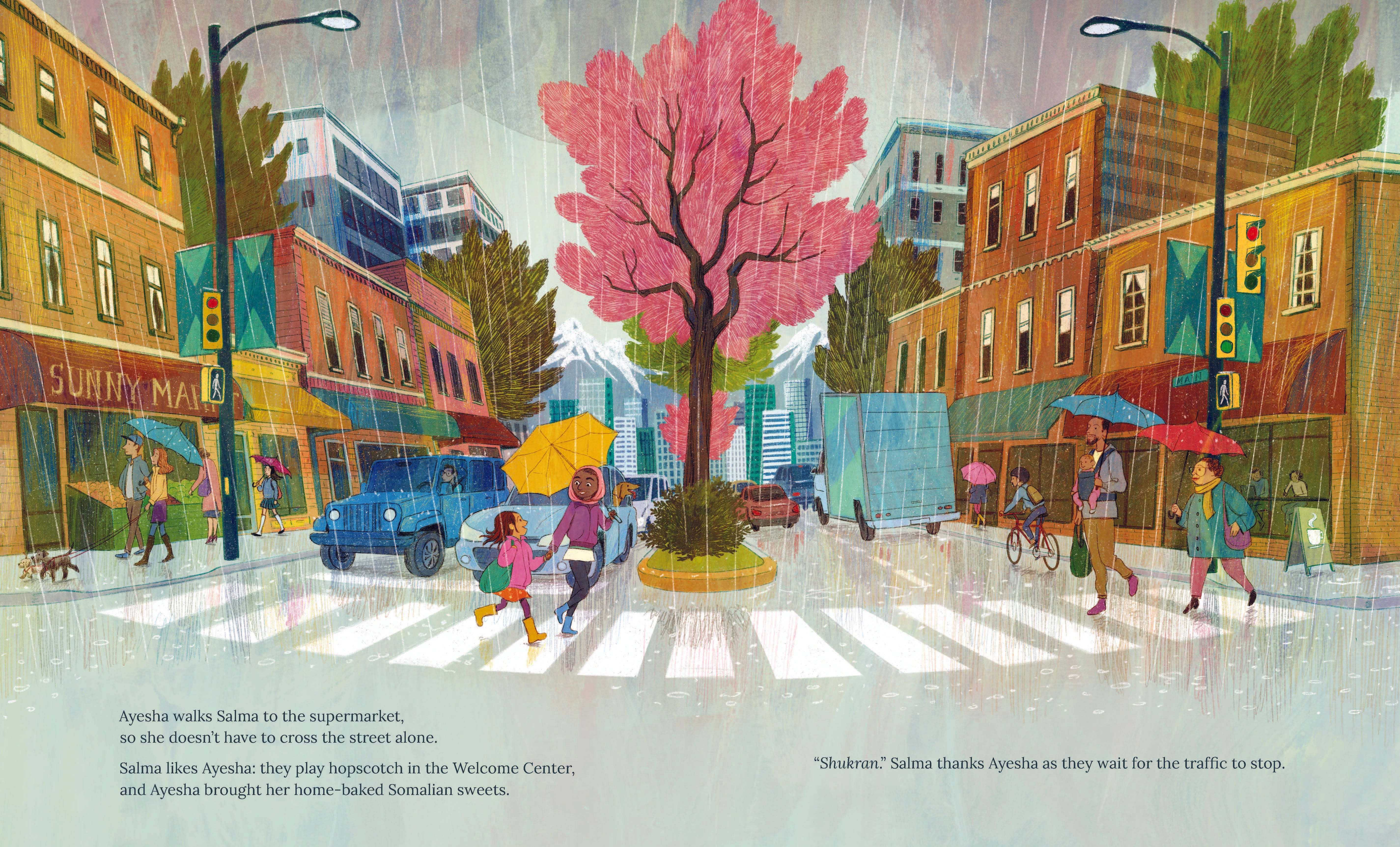 All Salma wants is to make her mama smile again. Between English classes, job interviews, and missing Papa back in Syria, Mama always seems busy or sad. A homemade Syrian meal might cheer her up, but Salma doesn’t know the recipe, or what to call the vegetables in English, or where to find the right spices! Luckily, the staff and other newcomers at the Welcome Center are happy to lend a hand—and a sprinkle of sumac.