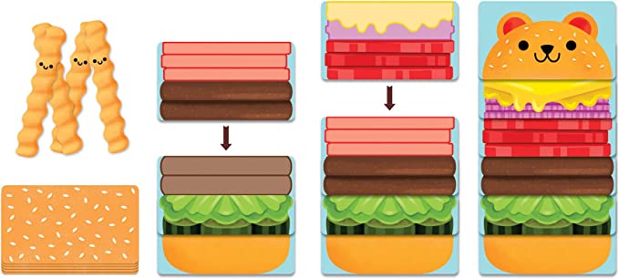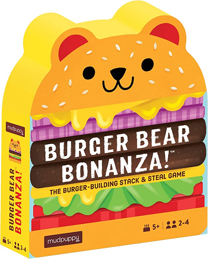 The Burger Bear Bonanza! Game from Mudpuppy is a fun new game to see who can really stack up! 2-4 players can match, stack & steal toppings to build burger bears! Whoever completes 2 burger bears wins and is the bear to beat! • Includes: 64 cards, 36 french fry tiles, instructions • Shaped box: 6.5 x 7.5 x 1.75", 16.5 x 19 x 4.5 cm • All Mudpuppy products adhere to CPSIA, ASTM, and CE Safety Regulations • 2-4 players • Ages 5+