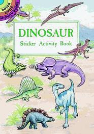 Twenty-one reusable, brightly colored dinosaur stickers: 1. Coelurosaurus, 2. Ankylosaurus, 3. Deinonychus, 4. Protoceratops, 5. Polacanthus, 6. Styracosaurus, 7. Dimetrodon, 8. Protoceratops, 9. Stegosaurus, 10. Ornithomimus, 11. Iguanodon, 12. Archaeopteryx, 13. Triceratops, 14. Pterodactyl,
