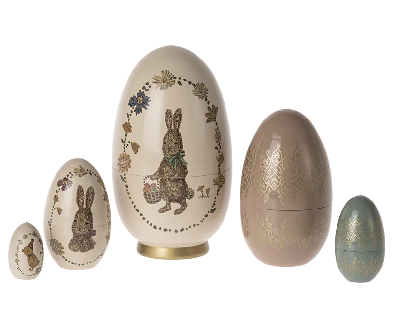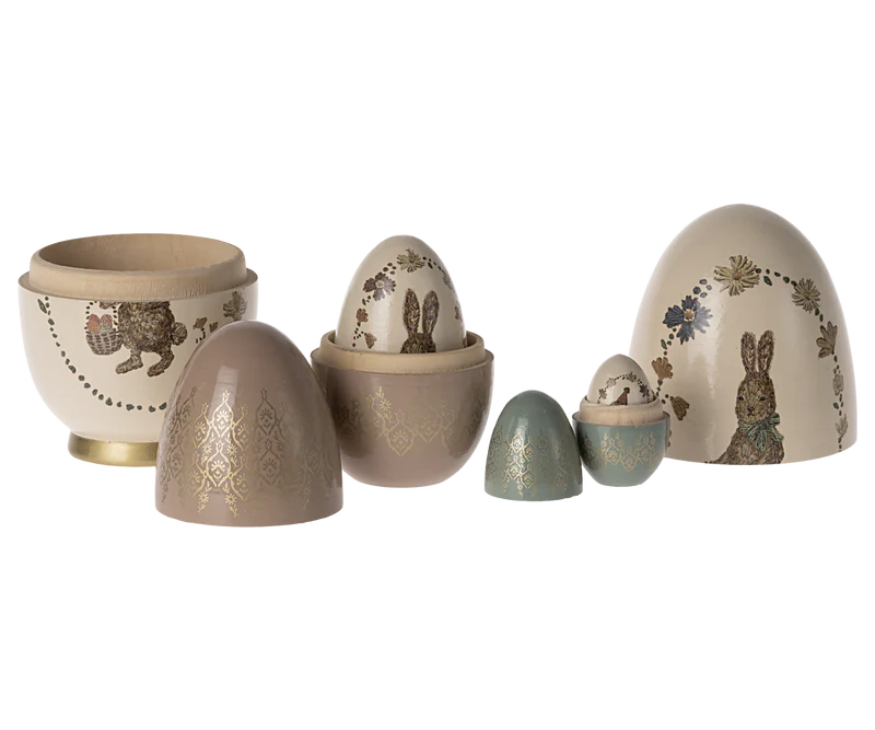 Make the Easter season even more magical with this lovely babushka egg set. It consist of 5 wooden eggs in different sizes which are packed into each other. All eggs are beautifully decorated with special Maileg drawings.