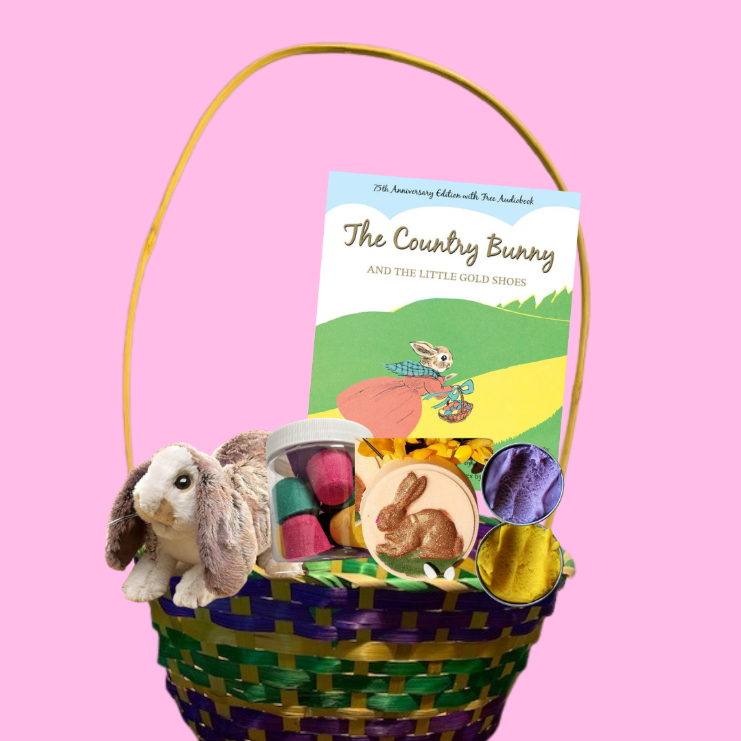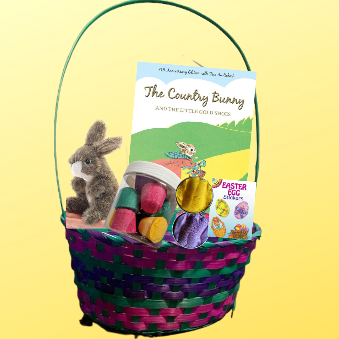 Green Basket- contains two tins of Easter coloured dough from local mompreneur PlayGrowDough, a package of "bunny poo" bath bombs from local mompreneur Sweet Soaks, two bunny finger puppets from Folkmanis, two mini sticker books and two brand new stories for your family from our wonderful collection.