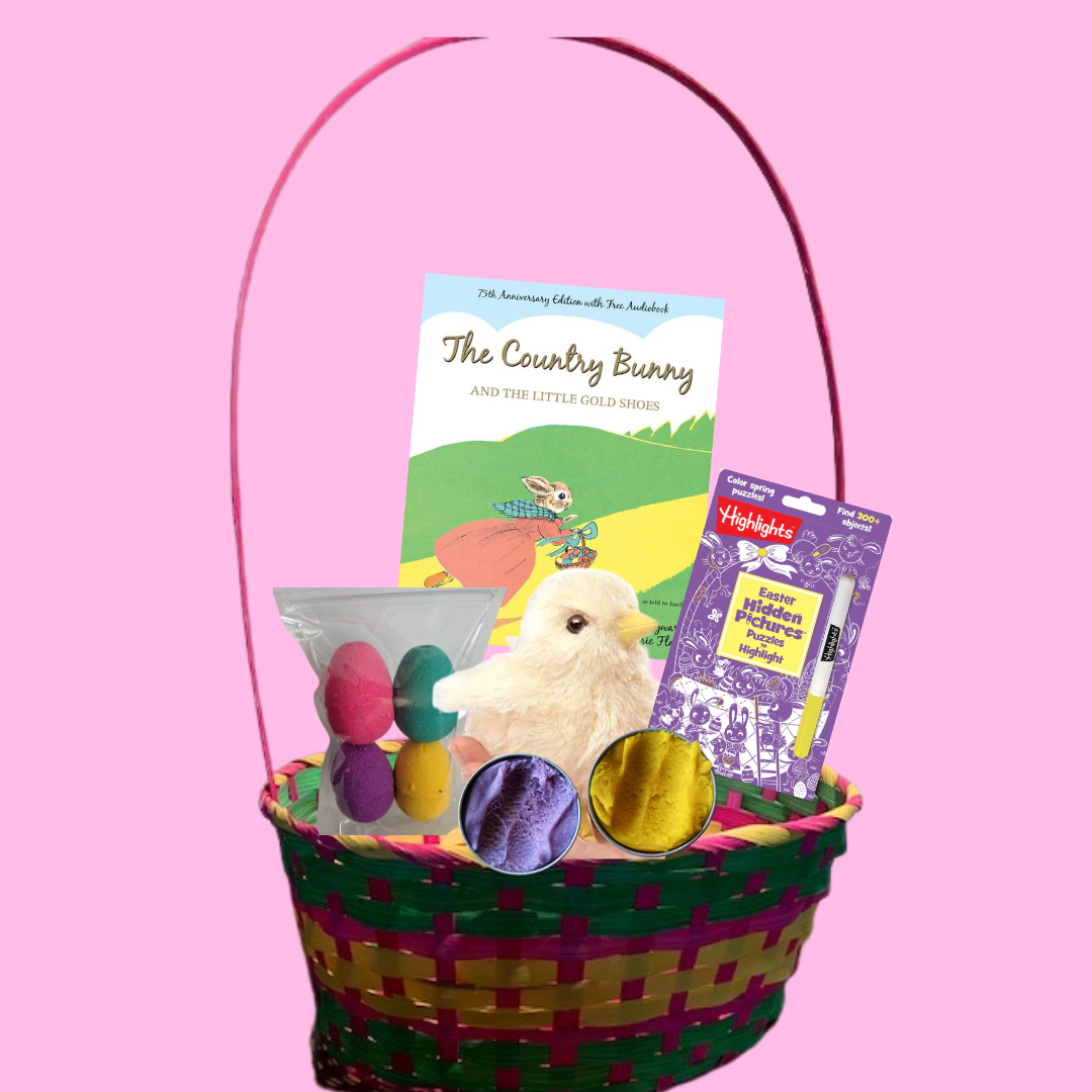 Pink Basket- contains two tins of Easter coloured dough from local mompreneur PlayGrowDough, a package of egg-shaped bath bombs from local mompreneur Sweet Soaks, two chick finger puppets from Folkmanis, an activity book and a brand new book for your family from our wonderful selection.