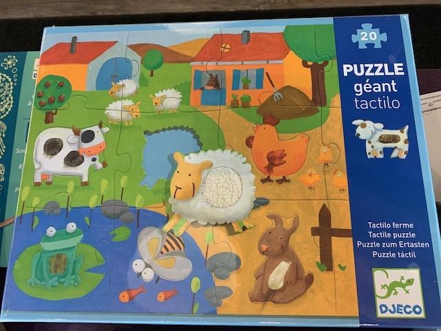 Large 20 piece puzzle with 8 farm animals in different textures to be placed and discovered by touch