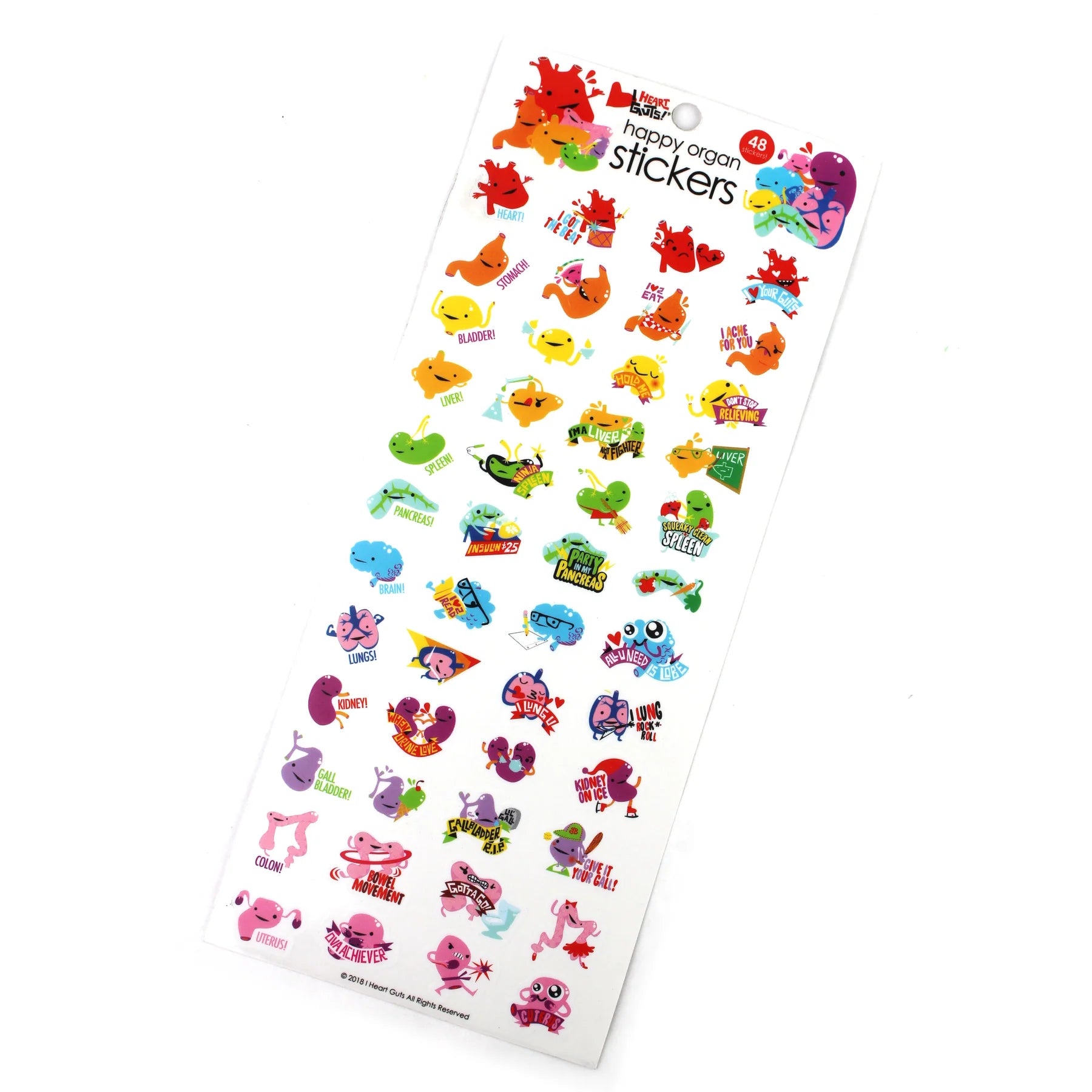 Sticker sheet features heart, stomach, bladder, liver, spleen, pancreas brain, lungs, kidney, gallbladder, colon and uterus in four different silly poses each. All your major organs arranged in satisfying rainbow order. It's an anatomy dream!