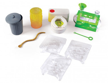 16-piece kit includes a motorized toilet bowl mixer: The other included items are 2 bubble beakers with slime stand, biohazard container, garbage can shaker, freaky funnel, maggot mold, barf mold, centipede mold, worm spoon, bubble wand, and 24-page illustrated activity book