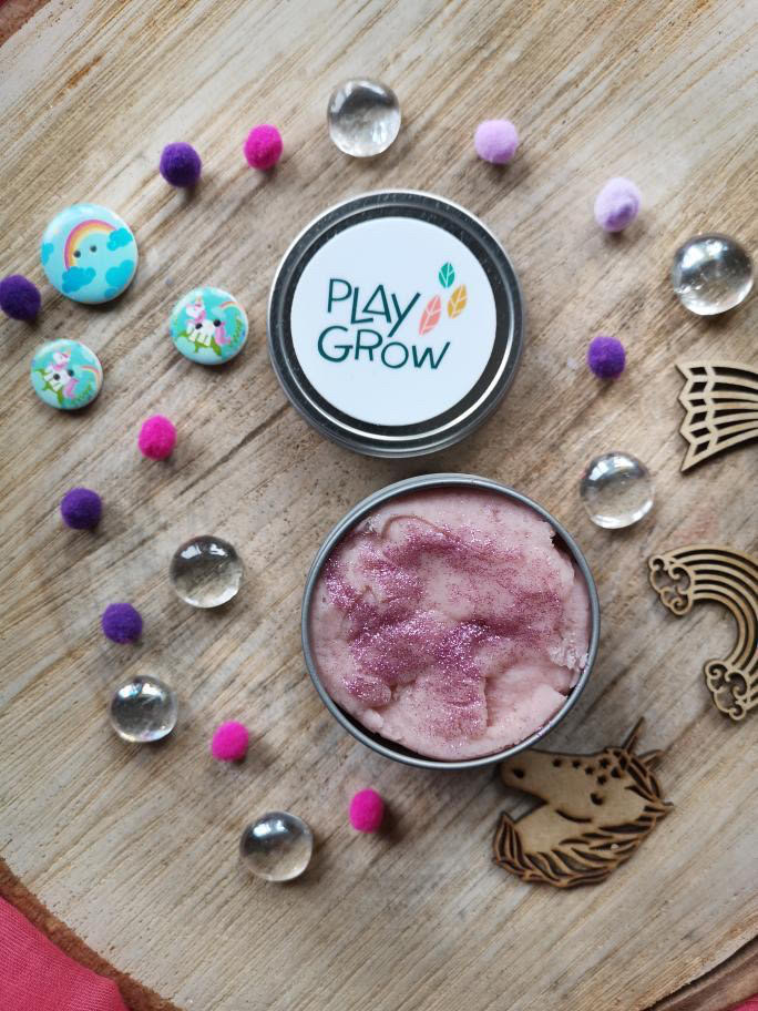 These kits include: 4oz unicorn dough (eco glitter, pink dough with rose and vanilla scent) 3 wooden unicorn inspired cut outs 6 glass gems 3 wooden unicorn buttons A handful of pink and purple pom poms. Play dough and loose parts are a choking hazard. Ages 3+ and adult supervision encouraged.