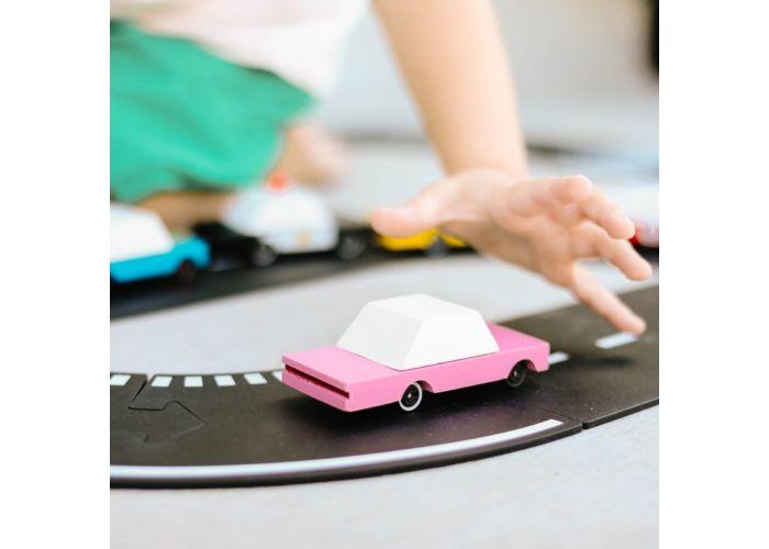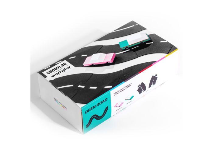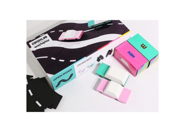 Includes: 12 Waytoplay road parts (12 curves)and 2 Candylab cars (Teal wagon and Pink Sedan)